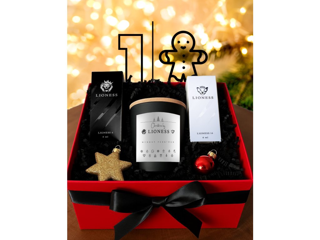 Luxusní set se svíčkou Medový perníček, pánským autoparfémem Lioness 6 a dámskou vůní Lioness 16. Elegantní vánoční balení v červené krabičce.