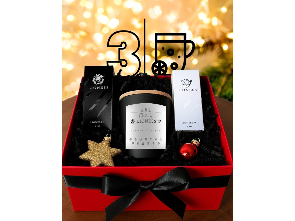Sada s výraznou svíčkou Vánoční punč, pánskou vůní Lioness 4 a dámskou Lioness 11. Elegantní dárek pro milovníky luxusních vůní.